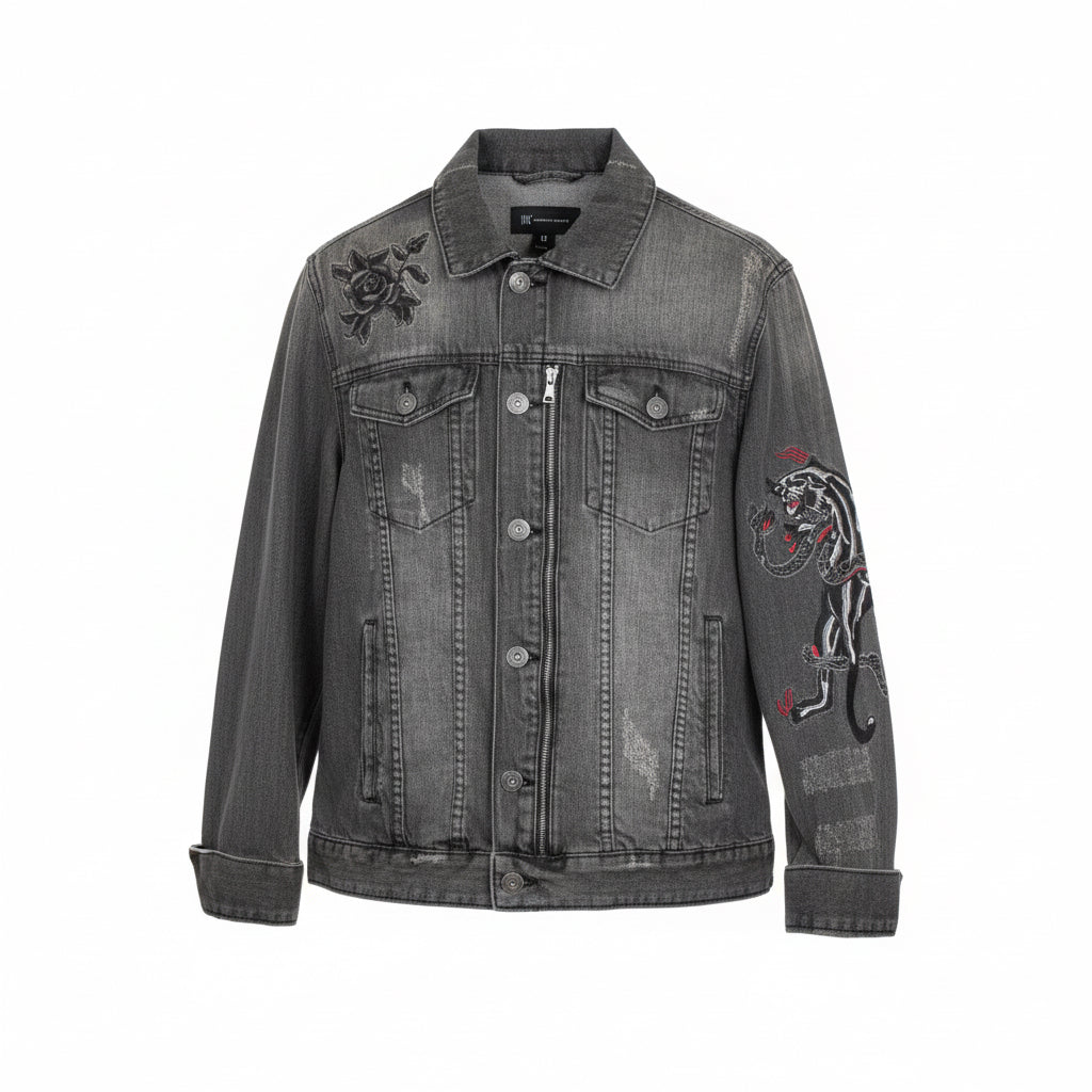 International Concepts denim jacket embroidered with roses and panthers, Charcoal color, zipper detailing, size M